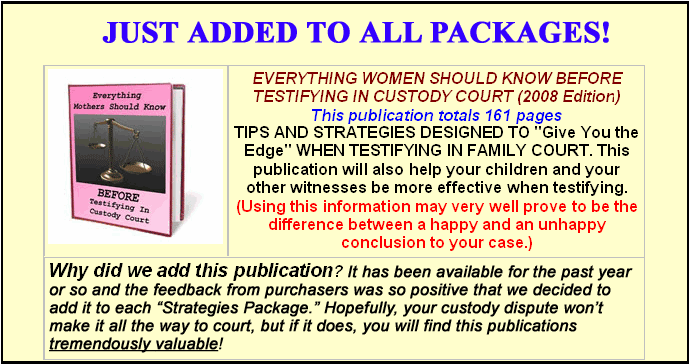 STATE-SPECIFIC BONUS SUPPLEMENT! Now choose a 15 PAGE BONUS SUPPLEMENT with all of the newest custody/visitation/support information that you need to know about YOUR STATE or ANY STATE! SELECT YOUR CHOICE OF STATE SUPPLEMENT AT NO ADDITIONAL COST! |